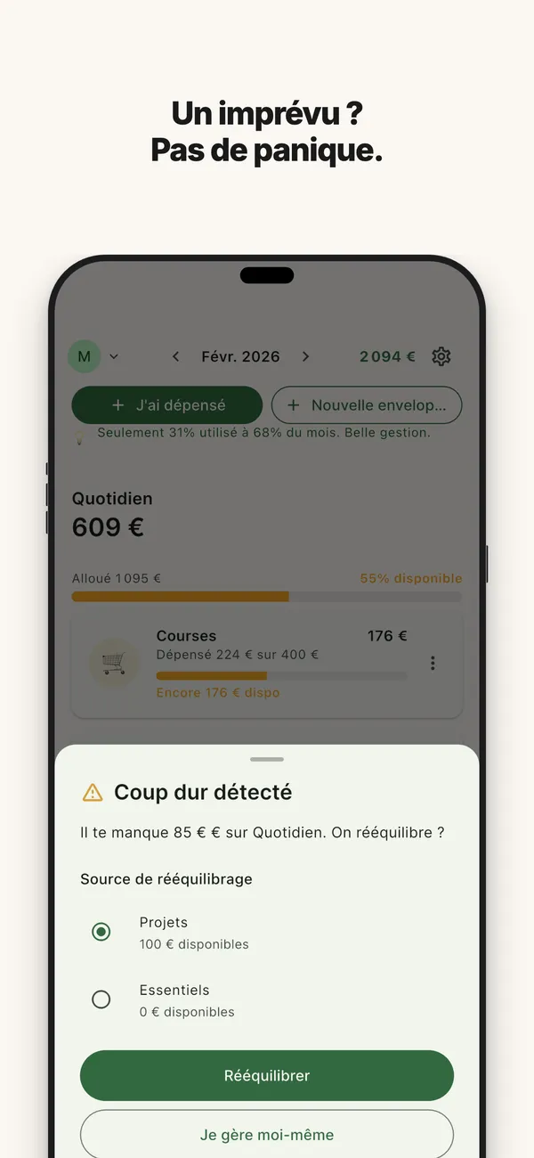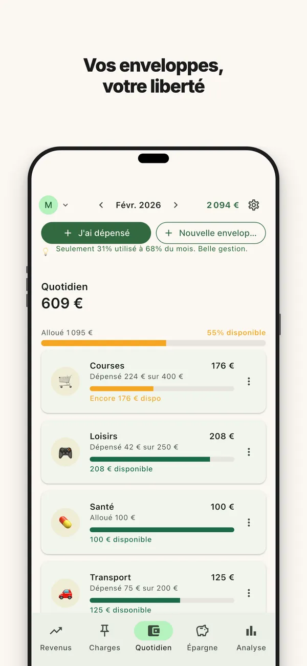 Chaque euro est affecté à une pochette (courses, loyer, loisirs, épargne). Visualisation instantanée du solde restant.