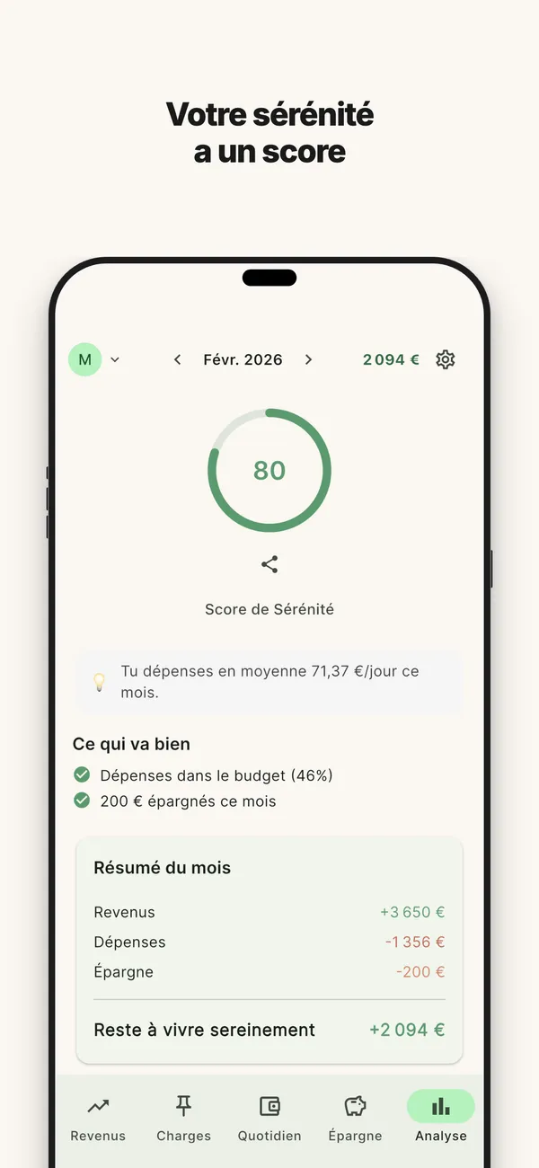 - Score Sérénité — un indicateur unique (0-100) qui mesure la santé financière globale, pas seulement les dépenses. Aucune autre app de budget ne propose cet indicateur.